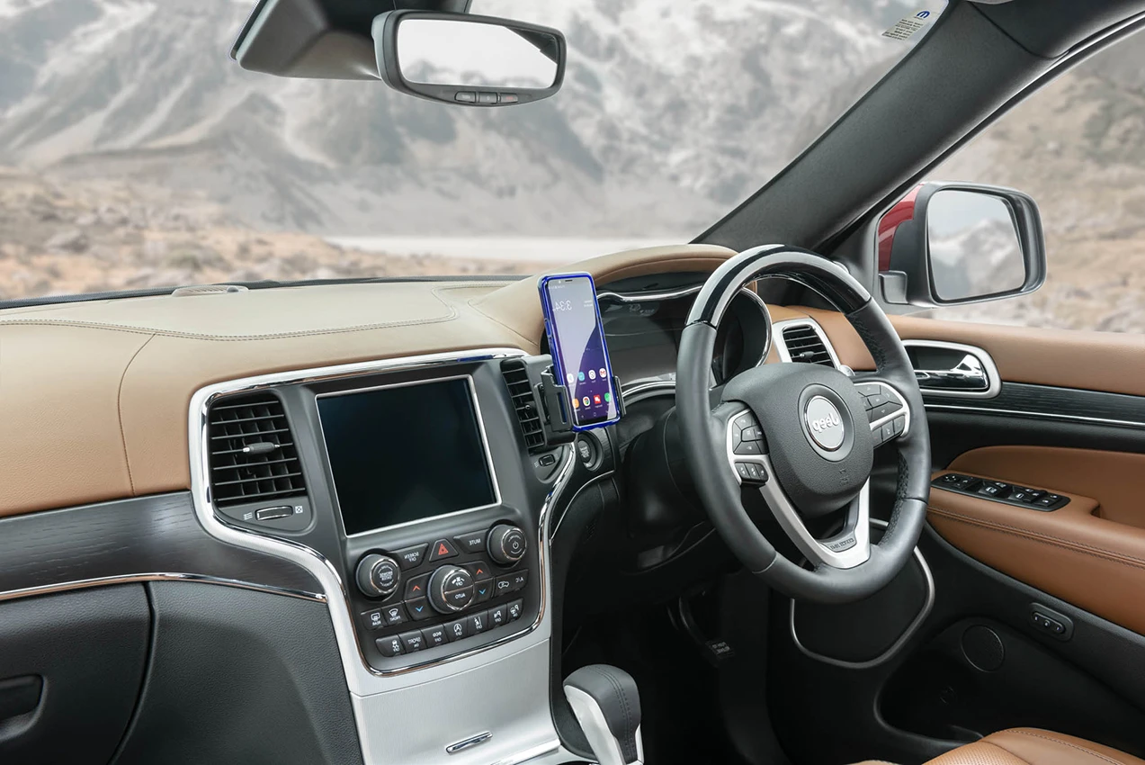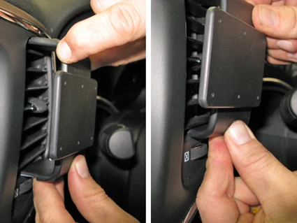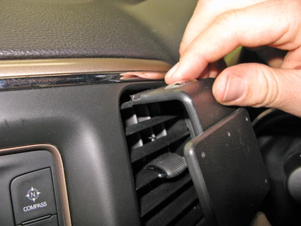 Press firmly upwards on the bottom part of the ProClip so it flexes upwards, and hook the grooved edge onto the lower air vent edge.
