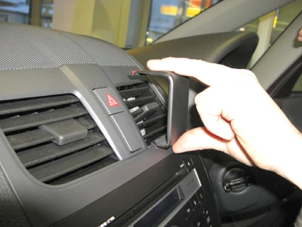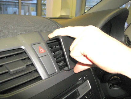 Press downward on the upper part of the ProClip so the ProClip flexes slightly. Then press the upper part forward into the air vent, so the angled edge is placed under the frame surrounding the air vent.