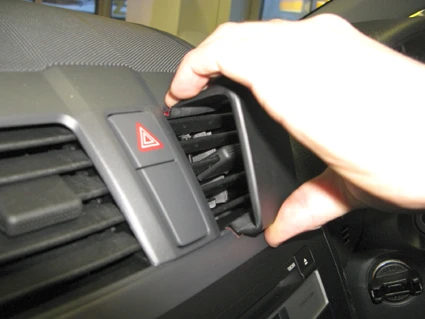 Release the pressure so the angled upper edge hooks under the frame surrounding the air vent.