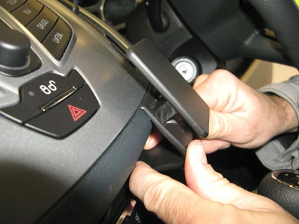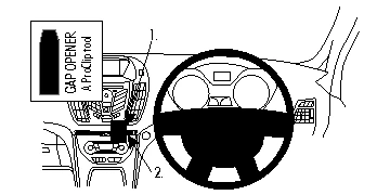 Use the enclosed alcohol pad to clean the area where the ProClip is to be installed. Press the thin end of the enclosed gap opener into the gap between the control panel and the dashboard. Peel off the adhesive tape covers on the ProClip. Press the curved edge on the upper part of the ProClip into the gap next to the gap opener.
