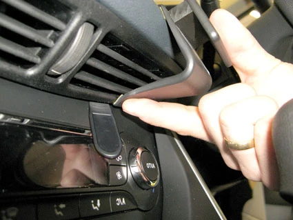 Press the gap opener into the gap between the frame surrounding the air vent and the center console. Pull the ProClip downward. Hook the angled edge on the lower part of the ProClip into the gap next to the gap opener. Press upward on the lower part of the ProClip so the angled edge goes all the way into the gap. Pull out the gap opener.