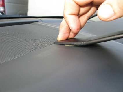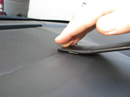 Use the enclosed alcohol pad to clean the area where the ProClip is to be installed. Peel off the adhesive tape covers on the ProClip. Place the angled edge on the upper part by the gap between the speaker vent and the dashboard. Press downward on top of the ProClip so the speaker vent flexes slightly.