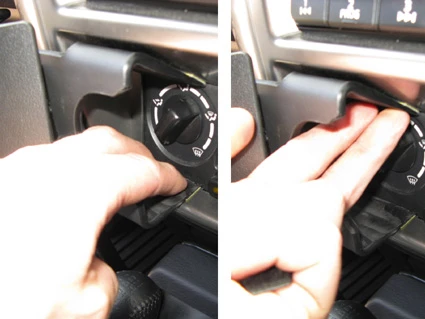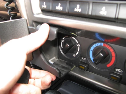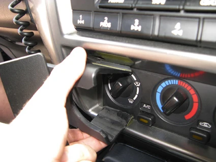 Use the enclosed alcohol pad to clean the area where the ProClip is to be installed. Peel off the adhesive tape covers on the ProClip. Press the angled edge on the lower part of the ProClip into the gap between the climate control panel and the surrounding frame.