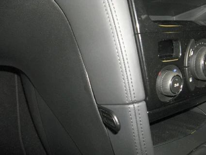 Press the curved edge on the left part of the ProClip into the gap next to the gap opener. Flip the ProClip rightward, toward the steering wheel, so the curved left edge hooks into the gap.