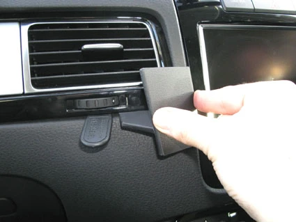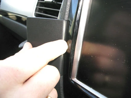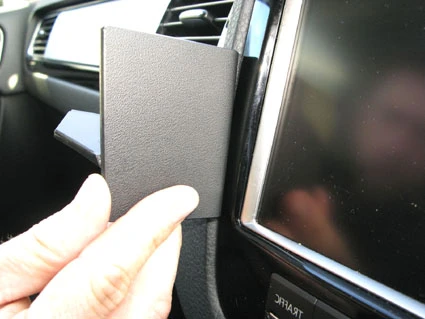 Use the enclosed alcohol pad to clea the area where the ProClip is to be installed. Press the thin end of the enclosed gap opener into the gap between the trim surrounding the air vent and the dashboard, to widen the gap. Peel off the adhesive tape cover on the ProClip. Press the curved edge on the right part of the ProClip into the gap bteween the center console and the dashboard.