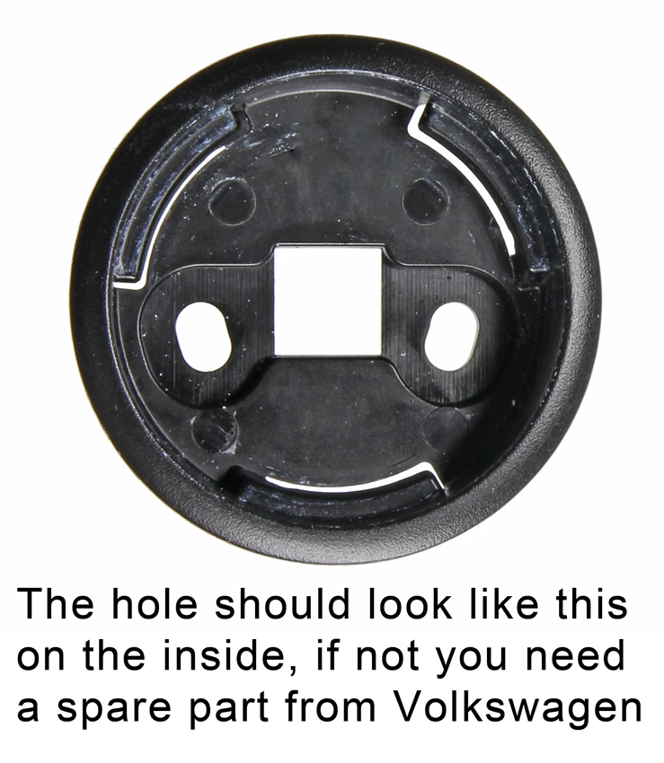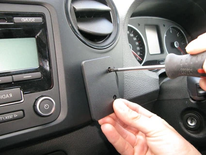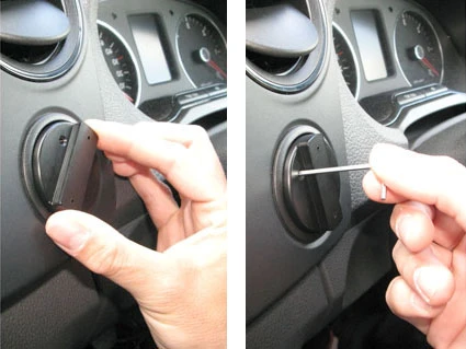 Remove the round cover below the air vent. Place Part 1 in the hole (Part 1 only fits one way into the hole, if it does not fit turn Part 1 sligthly to get it into the correct position in order to fit)