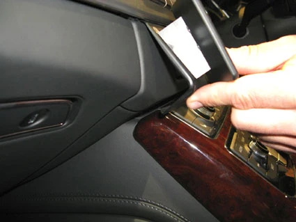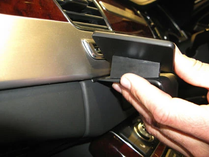 Pull the lower part of the ProClip downward and press it forward. Release the pressure so the angled edge hooks into the gap in the dashboard.