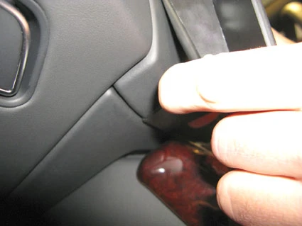 Use the enclosed alcohol pad to clean the area where the ProClip is to be installed. Peel off the adhesive tape covers on the ProClip. Press the angled edge on the upper part of the ProClip into the gap between the trim and the dashboard.