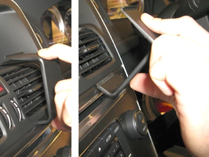 Press the curved edge on the lower part of the ProClip into the gap between the frame surrounding the air vent and the control panel. Flip the ProClip upward/forward so the curved lower edge goes all the way into the gap and hooks behind the control panel.
