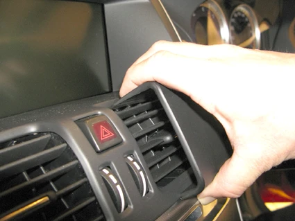 Press the upper part of the ProClip downward and then forward into the upper part of the air vent. Keep the lower part of the ProClip in place in the same position, in the same time pull the upper part toward you so the gap under the frame surrounding the air vent is widened and the angled upper edge of the ProClip hooks into the gap under the frame surrounding the air vent.