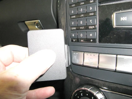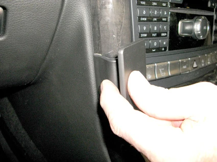 Press forward on the left side of the ProClip, in the same time press the left part toward the center console. Hook the angled edge on the left part of the ProClip into the gap between the frame surrounding the control panel and the center console sidewall.