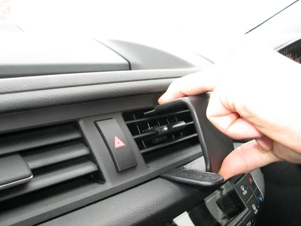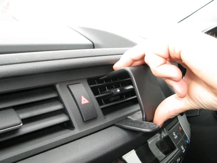 Press the upper part of the ProClip downward so the ProClip flexes a bit. In the same time: press the ProClip forward so the lower edge goes into the gap next to the gap opener and the upper edge goes into the upper part of the air vent. Release the pressure when you see that the lower edge is all the way into the gap and the upper edge rests on the frame surrounding the air vent. Pull out the gap opener.