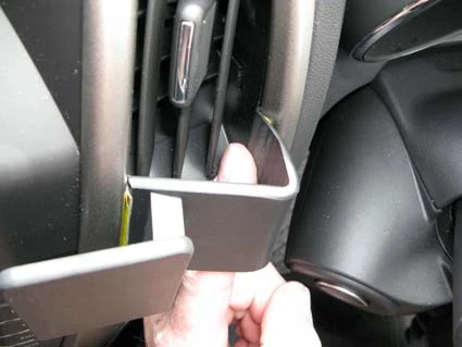 Press the right part of the ProClip leftward, and then forward. Hook the angled right edge of the ProClip into the gap between the air vent and the surrounding frame.