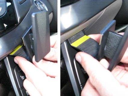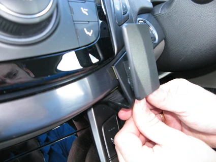 Hook the angled edge on the upper part of the ProClip into the gap between the dashboard and the control panel.