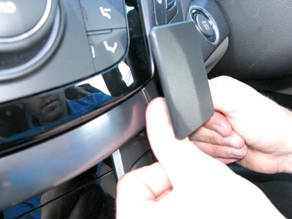 Use the enclosed alcohol pad to clean the area where the ProClip is to be installed. Peel off the adhesive tape covers on the ProClip. Press the curved edge on the lower part of the ProClip into the gap between the dashboard and the center console.