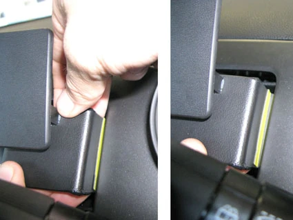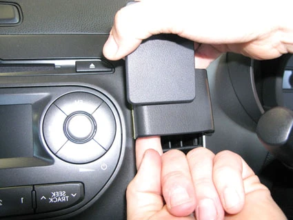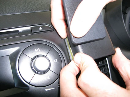 Press the ProClip rightward and hook the angled edge on the left part into the gap between the air vent and the panel surrounding the stereo.