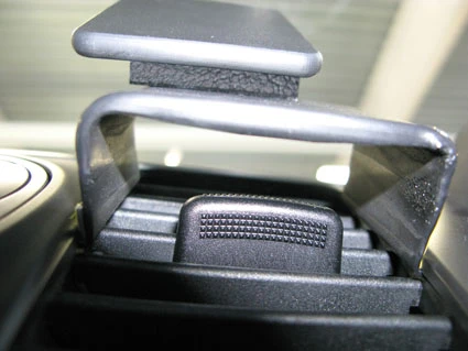 Use the enclosed alcohol pad to clean the area where the ProClip is to be installed. Pee off the adhesive tape covers on the ProClip. Press the angled edge on the right part of the ProClip into the gap between the air vent and the surrounding panel. Pull the ProClip toward you so the panel flexes and the gap is slightly widened. Then press the ProClip rightward so the angled edge goes all the way into the gap.