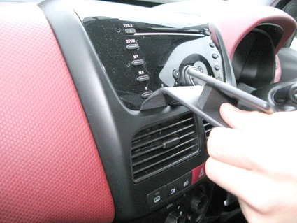 Use the enclosed alcohol pad to clean the area where the ProClip it so be installed. Press the thin end of the enclosed gap opener into the gap between the frame surrounding the air vent and the stereo, to widen the gap. Peel off the adhesive tape cover on the ProClip. Press the curved edge on the upper part of the ProClip into the gap next to the gap opener.