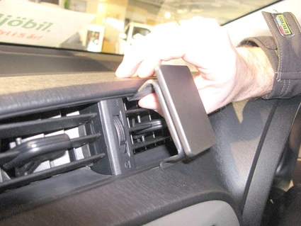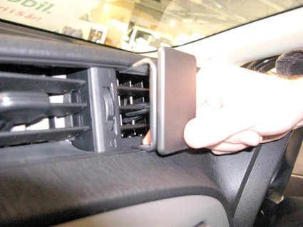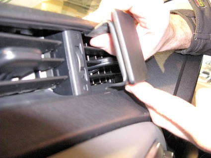 Press the lower part of the ProClip upward and forward. Hook the angled edge into the gap between the air vent and the dashboard.