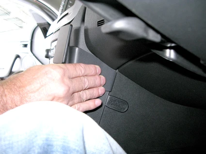Press forward on the right side of the ProClip so the right edge hooks into the gap above the gap opener. Press the right part of the ProClip toward the center console so the angled edge hooks into place properly. Pull out the gap opener.