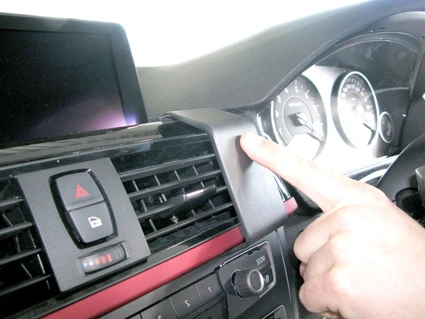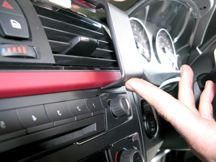 Use the enclosed alcohol pad to clean the area where the ProClip is to be installed. Peel off the adhesive tape cover on the ProClip. Press the angled edge on the lower part of the ProClip into the gap between the frame surrounding the air vent and the control panel.