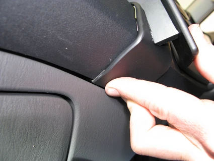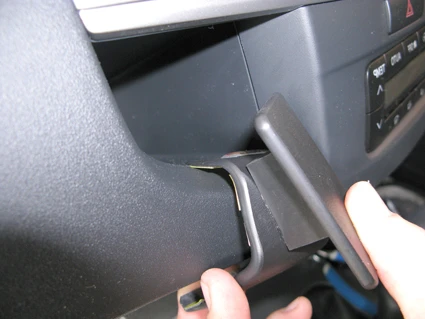 Press the ProClip forward and hook the angled lower edge into the gap between the upper and the lower section of the dashboard. Press upward on the lower part of the ProClip so the angled edge goes all the way into the gap.