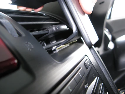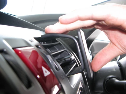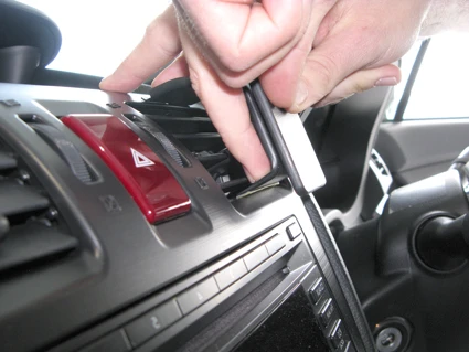 Press the upper part of the ProClip downward and the forward. Hook the thin upper edge of the ProClip into the gap between the air vent and the surrounding frame.