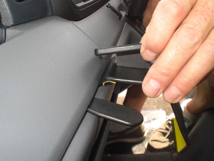 Use the enclosed alcohol pad to clean the area where the ProClip is to be installed. Press the thin end of the enclosed gap opener into the gap between the two dashboard sections, to widen the gap. Peel off the cover of adhesive tape on the ProClip.