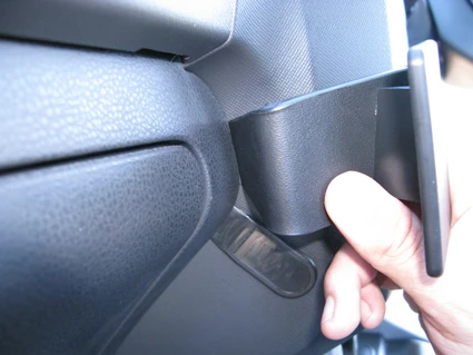 Use the enclosed alcohol pad to clean the area where the ProClip is to be installed. Press the thin end of the enclosed gap opener into the gap between the center console and the dashboard surrounding the glove compartment. Peel off the adhesive tape cover on the ProClip. Press the angled edge on the left part of the ProClip into the gap above the gap opener. Pull out the gap opener.