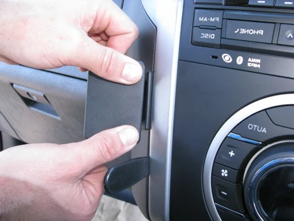 Press the gap opener into the gap between the frame surrounding the control panel and the center console edge. Flip the ProClip rightward so the angled left edge hooks behind the dashboard surrounding the glove compartment.