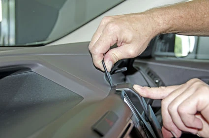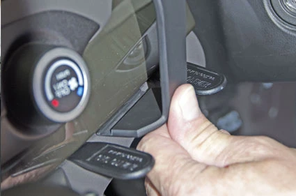 Press the thin end of the enclosed gap openers into the gap between the two panels shown in the photo, to widen the gap. Use the enclosed alcohol pad to clean the area where the ProClip is to be installed. Peel off the cover of adhesive tape on the ProClip. Press the grooved edge on the lower part of the ProClip mount into the gap between the gap openers. It will help to insert the left side first and then press the right side in. Pull out the gap openers.
