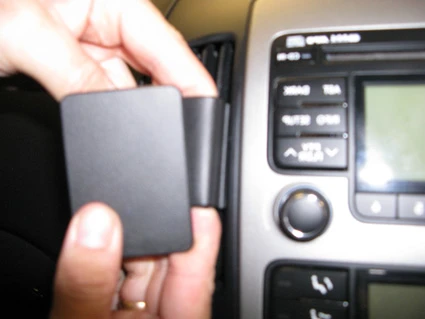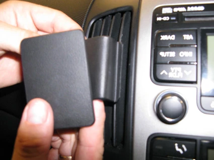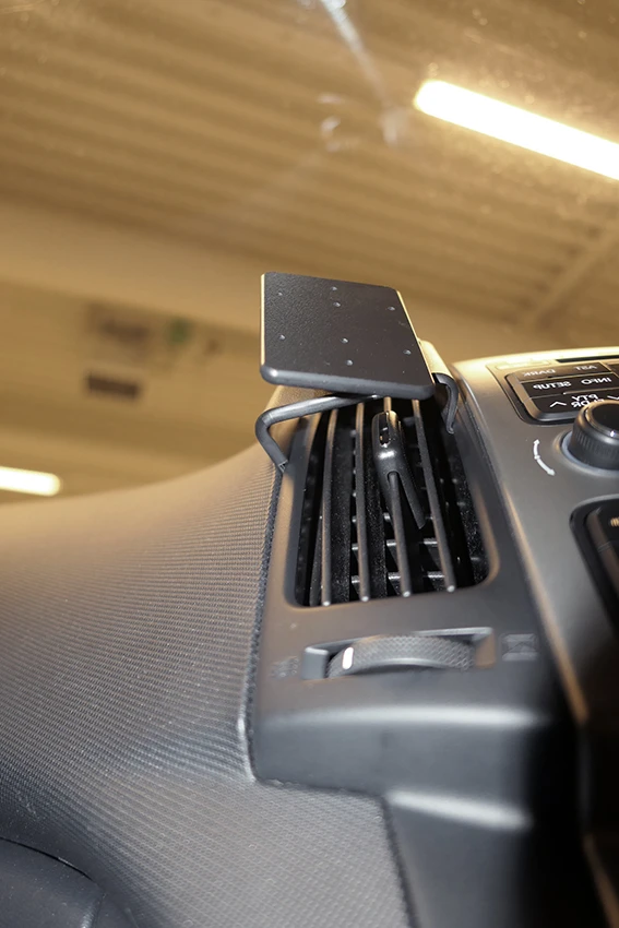 Press the grooved edge on the left part of the ProClip into the gap between the frame surrounding the air vent and the dashboard. Press forward on the left part of the ProClip so you hear/feel it snaps into place.