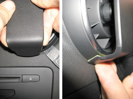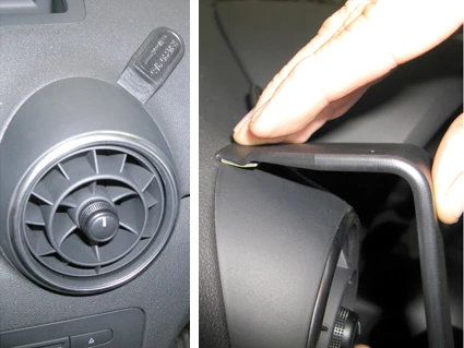 Use the enclosed alcohol pad to clean the area where the ProClip is to be installed. Press the thin end of the enclosed gap opener into the gap between the frame surrounding the air vent and the dashboard, to widen the gap obliquely above the air vent. Peel off the adhesive tape covers on the ProClip. Press/Hook the angled edge on the upper part of the ProClip into the gap next to the gap opener. Press downward on top of the ProClip so all of the the curved angled edge goes all the way into the gap. Pull out the gap opener.