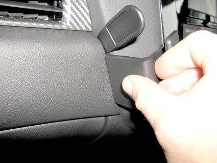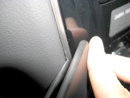 Use the enclosed alcohol pad to clean the area where the ProClip is to be installed. Press the thin end of the enclosed gap opener into the gap between the the thin frame surrounding the control panel and the dashboard, to widen the gap. Peel off the adhesive tape cover on the ProClip. Press the curved edge on the right part of the ProClip into the gap below the gap opener.