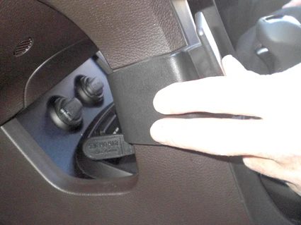 Press the thin end of the enclosed gap opener into the seam/gap on the upper part of the front side of the center console pillar, to widen the gap. Slide the gap opener downward. Use the enclosed alcohol pad to clean the area where the ProClip is to be installed. Peel off the adhesive tape cover on the ProClip.