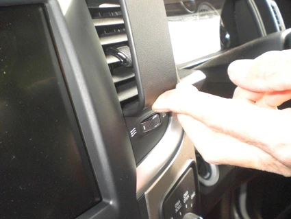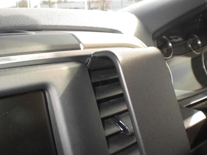 Use the enclosed alcohol pad to clean the area where the ProClip is to be installed. Peel off the adhesive tape cover on the ProClip. Hook/press the angled edge on the upper part of the ProClip into the air vent behind the frame surrounding the air vent.