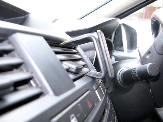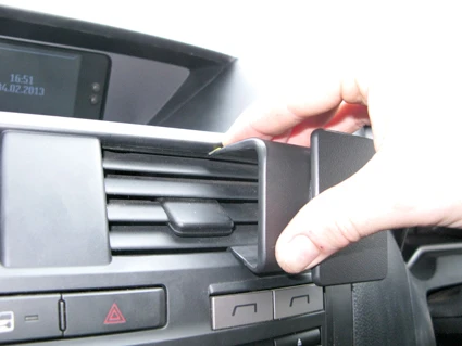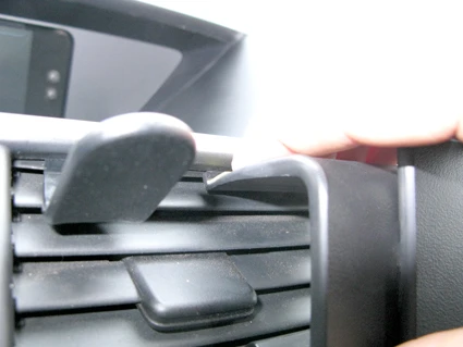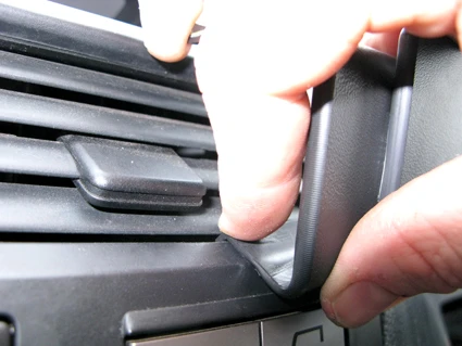 Press the angled thin edge of the enclosed gap opener into the gap between the air went and the surrounding frame, to widen the gap. Use the enclosed alcohol pad to clean the area where the ProClip is to be installed. Peel of the adhesive tape cover on the ProClip. Hook the curved edge of the lower part of the ProClip over the frame surrounding the air vent.