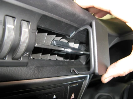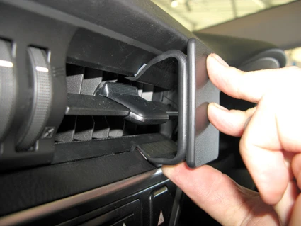 Press uppfard/forward on the lower part of the ProClip. Hook the angled lower edge of the ProClip into the gap between the air vent and the surrounding frame.