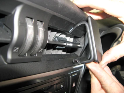 Use the enclosed alcohol pad to clean the area where the ProClip is to be installed. Peel of the adhesive tape covers on the ProClip. Hook the angled top part of the ProClip under the upper edge of the frame surrounding the air vent.