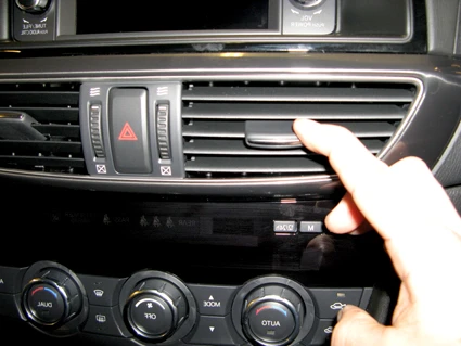 Adjust the air vent upward. Press the lower part of the ProClip upward/forward so the angled edge goes into the gap in the lower part of the air vent.