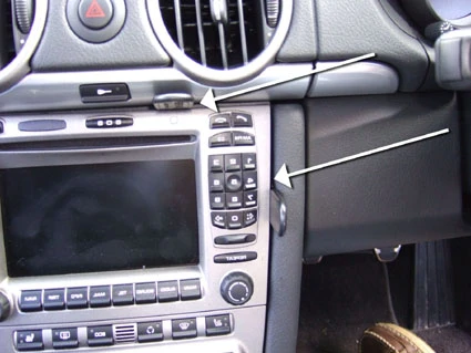 Press the thin end of the enclosed gap openers into the gap between the center console panel frame and the console edge, to widen the gap. See arrows in picture. Peel off the cover of adhesive tape on the ProClip.