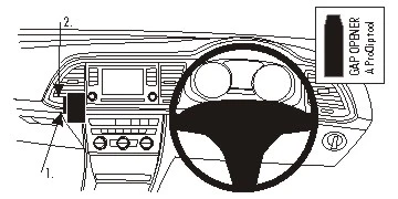 Use the enclosed alcohol pad to clean the area where the ProClip is to be installed. Press the thin end of the enclosed gap opener into the gap dividing the central control panel and the lower edge of the dashboard, to widen the gap. Remove the adhesive tape covers on the ProClip. Press the lower angled edge of the ProClip into the gap next to the gap opener.