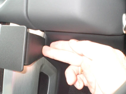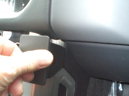 Press firmly downward on the right side of the ProClip face plate so the mount flexes forward and the angled edge on the right side of the mount hooks around the console edge panel.