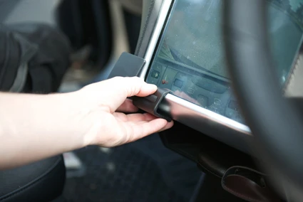 Hook the angled edge on the upper part of the ProClip over the panel frame surrounding the information screen.