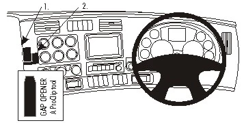 Press the thin end of the enclosed gap opener into the gap between the center console panel frame and the dashboard sidewall, to widen the gap. Use the enclosed alcohol pad to clean the area where the ProClip is to be installed. Peel off the adhesive tape cover on the ProClip.
