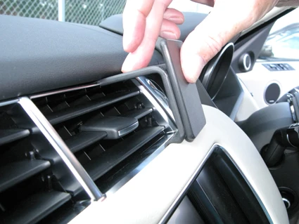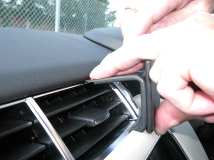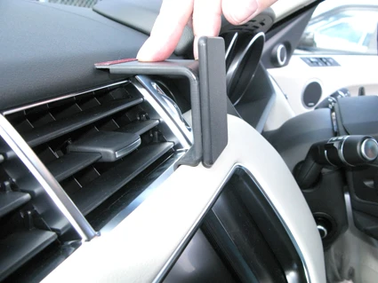 Peel off the adhesive tape cover on the ProClip. Press the angled bottom part of the ProClip into the gap between the frame surrounding the air vent and the center console.