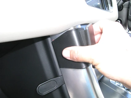 Press the gap opener into the gap by the right edge of the center console paneling. Press the right part of the ProClip forward, making it flex, so the angled edge hooks around the edge of the console paneling, above the gap opener. Remove the gap opener.