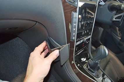 With your fingers behind the faceplate, flex the right angled edge around the console edge and insert the right angled edge into the gap next to the gap opener. Press forward on the right angled edge to insure it is all the way into the gap. Pull out the gap opener.