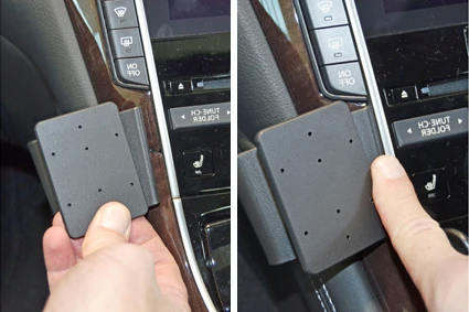 Use the enclosed alcohol pad to clean the area where the ProClip is to be installed. Peel off the adhesive tape cover on the ProClip. Press/hook the angled edge on the left side of the ProClip around the side panel and into the gap in the sidewall.