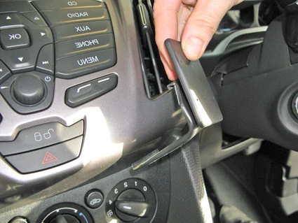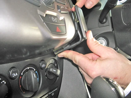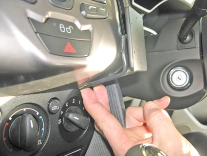 Press the angled edge on the lower part of the ProClip into the gap between the trim and the panel surrounding the stereo.
